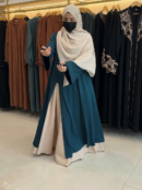 الفستان يتميّز بقصّة واسعة وانسيابية، مع تداخل أنيق بين لونين متناغمين يعطي عمقاً وجاذبية للإطلالة، مع أكمام واسعة تضيف لمسة فخمة وراحة في الحركة. تصميم مثالي للمرأة المحجبة الباحثة عن التميّز بدون تكلّف.